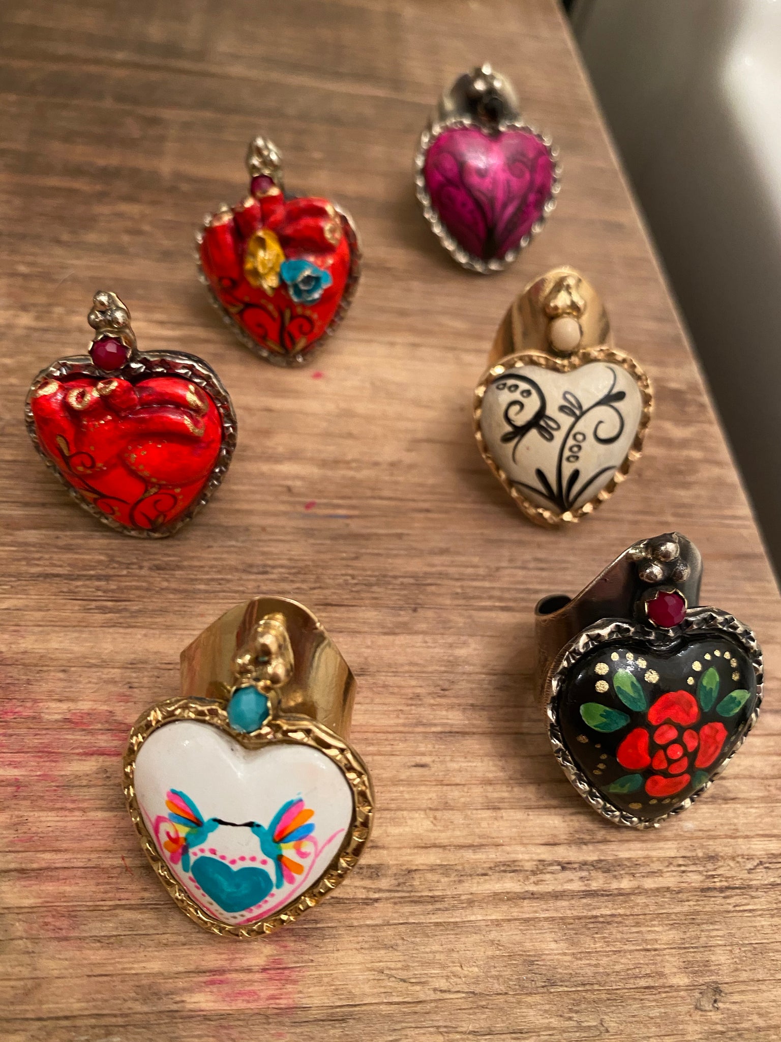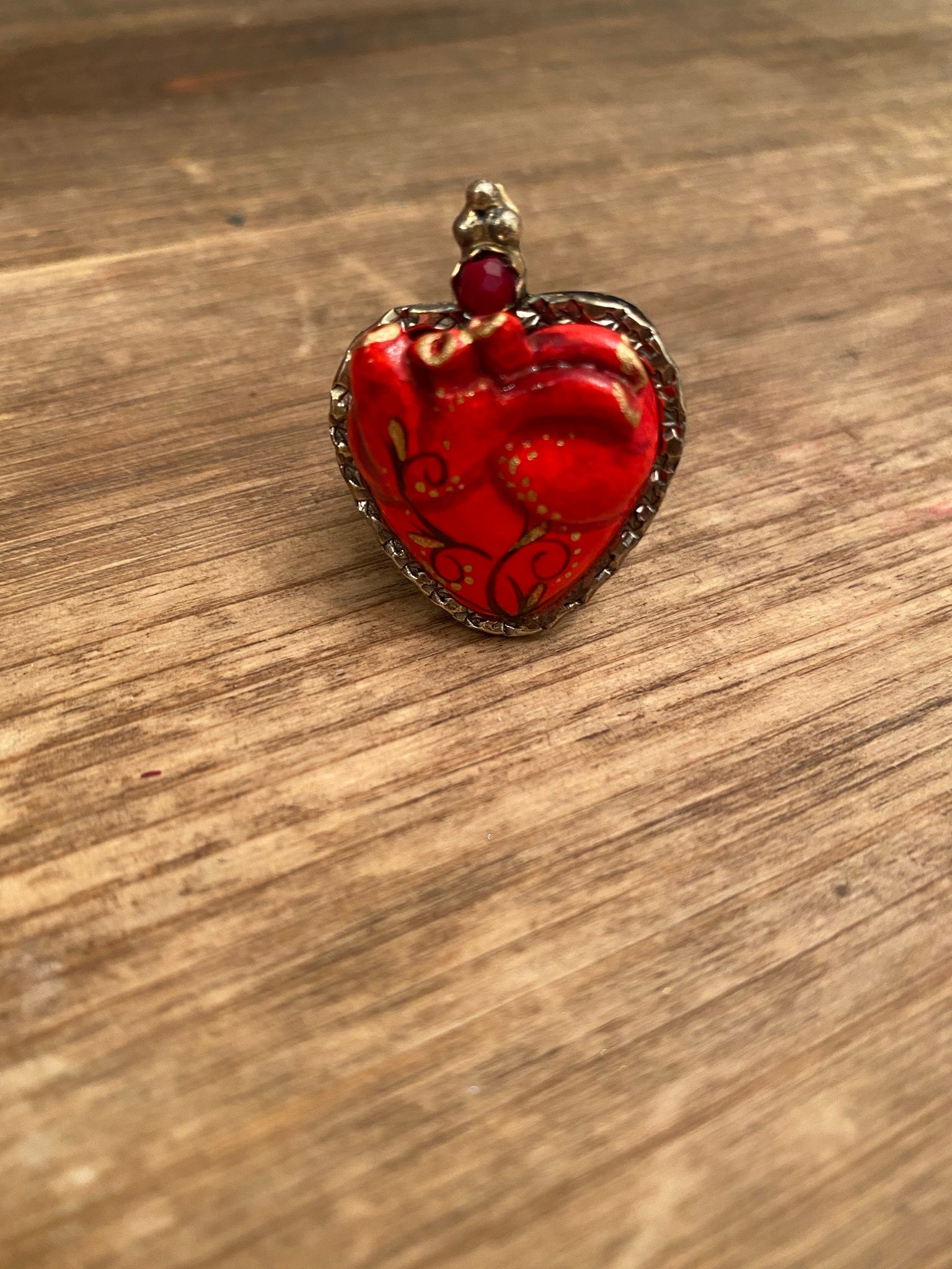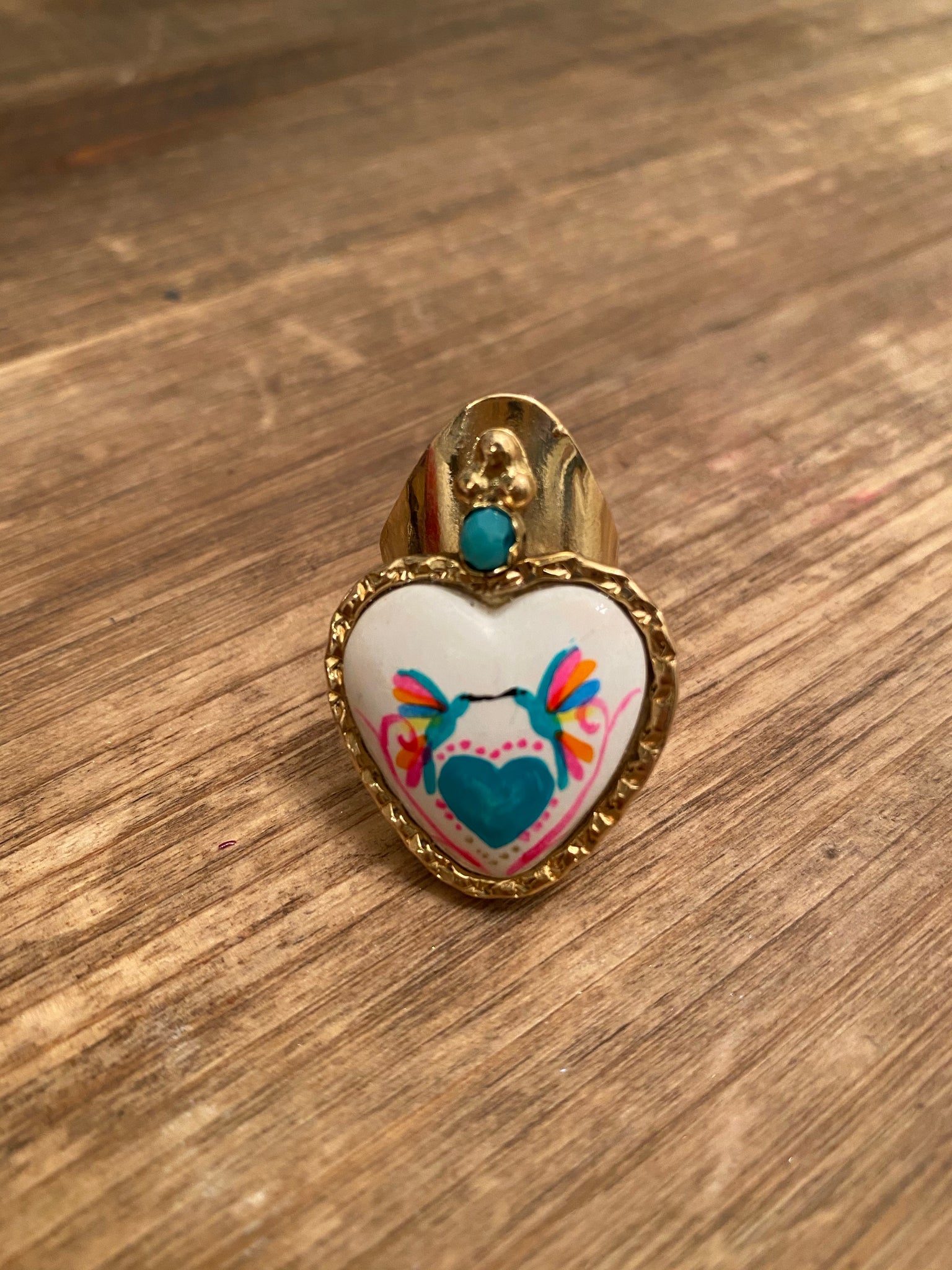 Adjustable brass statement handmade, hand painted heart. By Mexicana artist from León.